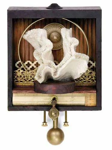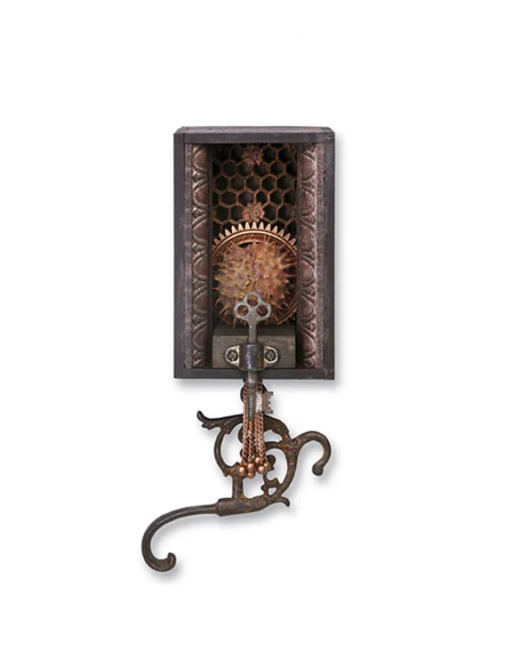 I have taken a very methodical approach to creating my assemblages. Found objects are arranged in a style following in the tradition of such artists as Joseph Cornell and Louise Nevelson. Balance, composition and texture are integral to my work that explores the redemptive qualities of discarded material. My limited color palette comes from the materials used, such as: aged, dark wood; brass and gold leaf; machine parts; rusted metal; glass and natural elements. Lately, I have been exploring silver tones as well. Ultimately, in contrast to their humble origins, these assemblages transcend the found quality of their individual parts to become shrine-like objects of beauty”.